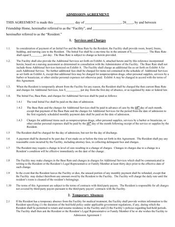GUIDE TO ADMISSION AGREEMENTS FOR RESIDENTIAL CARE FACILITY FOR THE ELDERLY GENERAL INSTRUCTIONS You may use these instructions and the following form as a guide to create an admission agreement for your facility, or you may modify and use this form. If you have questions, please contact your licensing office. Definition: ... Access Full Source